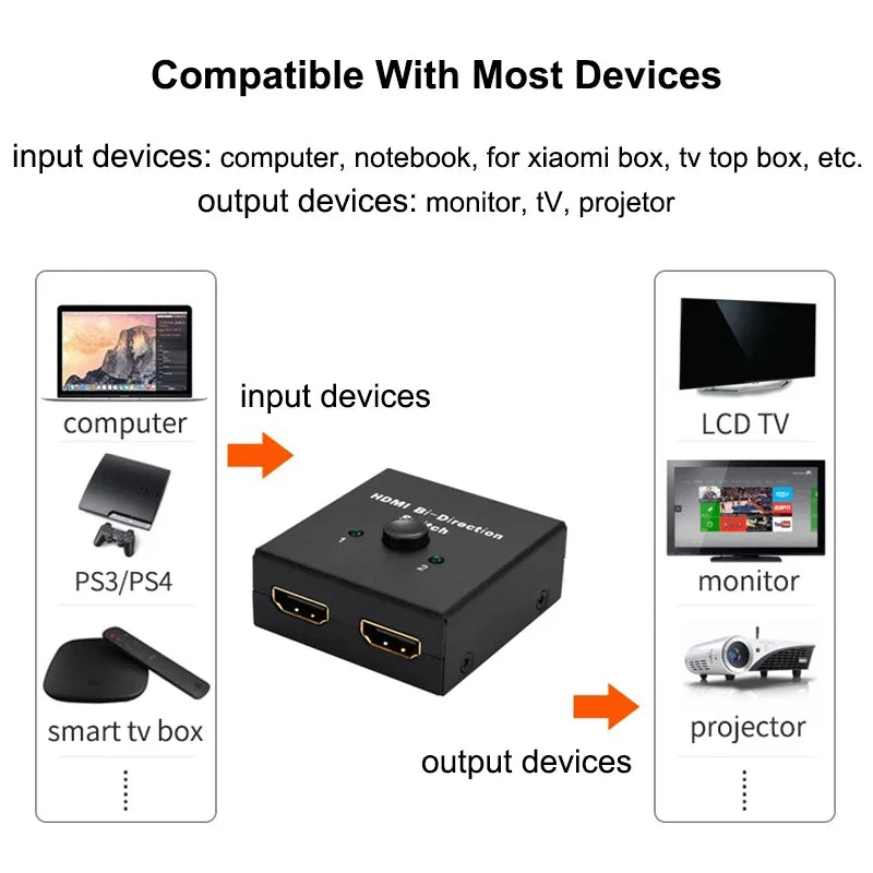 HDMI-compatible switcher 2 ports allows you connect most devices with standard HDMI-compatible interface, such as Nintendo Switch, Xbox 360/One, Full HD TVs, for PS3 PS4, Monitor, Projectors and so on.
